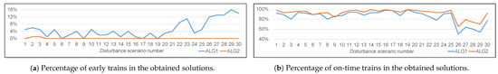 ALG1 typically provides solutions with a higher percentage of delayed trains (see Table 10). In the solutions to scenarios 1–10 obtained using ALG1, no train experiences a delay ≥ 30 min at their final stations. In the solutions obtained by the algorithms for scenarios 21–30, trains are always punctual at their final stations within 10 min (see Table 10). However, in the solutions obtained by ALG1, more trains experience smaller delays. See the comparatively higher percentages of delayed trains for ALG1 for scenarios 21–30 in Table 10.