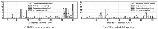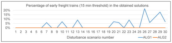 Disturbance scenarios 11–20 are those where a passenger train runs slower throughout its route. For a majority of these scenarios, ALG2 obtains solutions in which the values of d, i, and u are negligible (see Figure 3). ALG2 shows a similar performance for disturbance scenarios 21–30, wherein it obtains solutions with small values of the considered metrics. In the solutions obtained by ALG1 for the last ten scenarios, the freight trains incur comparatively (i) large departure deviations, (ii) larger number of unplanned stops, and (iii) higher increase in travel times (see Figure 3). The rescheduling performed by ALG1 often caused many freight trains to arrive early (see Figure 4), even when the train initially affected by the disturbance is a passenger train.