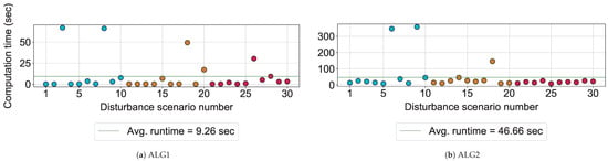 ALG1 solves any disturbance scenario in the dataset to completion in about 1 min. ALG2 can take up to 6 min to solve specific scenarios to completion in the dataset. Interesting disturbances occur in scenarios 6 and 9, where ALG2 takes more than 5 min to find the solution and prove its optimality. These two are the scenarios for which the Pareto-optimal solution obtained by ALG2 has a non-optimal TAD3 and TPD3 (see Table 12 and Table 13). This means that, for these scenarios, a trade-off needs to be made between minimizing e.g., TPD3 and the primary objective of ALG2, which is TFD3. Thus, compared to the output Pareto-optimal solution, a solution with a lower value of TPD3 cannot be obtained without increasing the value of e.g., TFD3. The longer computation times for these scenarios could be due to ALG2 trying to prove the Pareto-optimality of the obtained solution before reaching completion.
