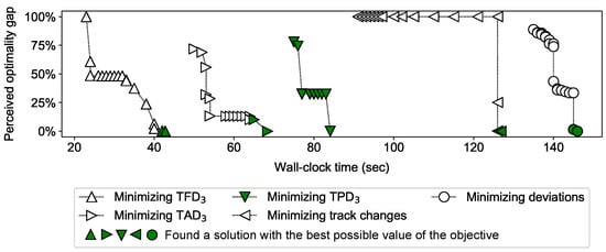 Similar to the case of scenarios 6 and 9, ALG2 takes a longer amount of time to reach completion for scenario 18. This is also a disturbance scenario for which the obtained Pareto-optimal solution has a non-ideal TAD3 and TPD3. Figure 6 shows the progress of ALG2 while solving scenario 18. Notice that, for this scenario, most of the time is spent in finding solutions rather than proving optimality of the found solutions. While minimizing TPD3, around 9 sec is taken by ALG2 to realize that the TPD3 of the obtained solution cannot be improved further, without increasing the values of the primary and the secondary objectives (TFD3 and TAD3, respectively). The gaps in Figure 6 correspond to the time taken for presolving and root relaxation.