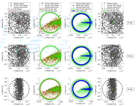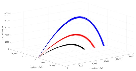 Figure 3, which depicts destination point dispersion patterns. This figure shows the ballistic trajectory that the vehicle follows for three different launch angles without using the control system at all, that is, it shows the flight of the system before implementing the improvements provided by the GNC system. The circular error probable (CEP), which is defined as the radius of a circle, centered on the mean, whose boundary is expected to include the landing points of 50% of the flights. The CEP is employed as a quality check parameter at the final step of the simulation as it is a valid reference for any utilized method. Indeed, the lower the CEP is the better the global GNC device is.