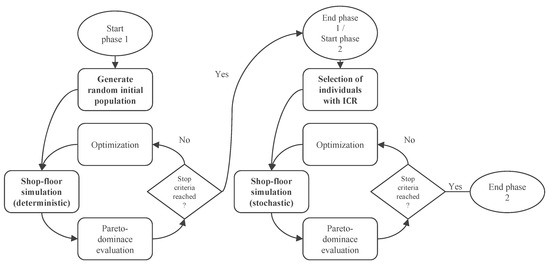 Phase one (Figure 3) starts with an initialization. This means that initial parameters of GA are selected along with the production model (planning task), and it is possible to define the attributes used for the CPRs. Next, initial solutions are generated randomly. Random numbers determine the weightings of the attributes . Based on the defined weightings for the respective attributes, the production is simulated (shop-floor simulation) with deterministic process times. The result is evaluated, and after a negative check of the stop criterion (unchanged objective values after a defined number of iterations), the weightings are changed by the GA. This process continues until the stopping criteria is reached. The result is a set of different weighting variations evaluated with respect to the objective value. In phase two, the corresponding weighting variants from phase one are firstly selected with the parameter initial copy rate . An means that the initial solution for stochastic optimization consists of copied solutions from the first phase. The other are random solutions. Then, in accordance with the theory of simulation-based optimization, GA adjusts weights until the stopping criteria is reached. Although the algorithm generated many schedules with different CPRs, the result is only the CPRs with which the best schedules were generated under stochastic conditions. Under stochastic conditions, the objective value will be identical when using this CPRs. The result of the training phase is therefore the result of the test phase.