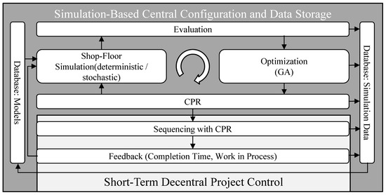 The presented concept (Figure 4) for decentralized sequencing is suitable for short-term sequencing at the operation level. For a short-term horizon, SHs are defined by how individual jobs are operatively sequenced on the shop floor. The result is therefore not an implemented schedule by the control system but evolved CPRs that are applied by the control system. The input to generate the CPRs is therefore a defined project pool with jobs or a predefined time horizon. The definition of the input is not part of the analysis but is taken as given in medium-term planning (e.g., MRP-II). Based on a project pool, the proposed algorithm for generating the CPRs is applied. The CPRs are transferred to production resources and applied for the defined validity period. This process is comparable to transfer of the production schedule to actual production. Various options are conceivable for technical implementation: In addition to the transfer to stationary computers at the workstations, the transfer to mobile devices (smartphones and handhelds) is also possible. A possible technical implementation of the CPRs with regard to job identification is for example barcode technology. The barcode contains all information about the projects. The stationary PC or handheld device contains CPRs for determining job priority. New incoming jobs can thus be added to the queue, and if renewable resources become available, the next job to be processed can be determined according to the CPRs. Thus, a rough status regarding finished jobs is known. Moreover, it is possible to share reconfiguration-relevant events (resource failure, etc.) through feedback and to initiate recalculation of CPRs based on the adjusted production parameters.