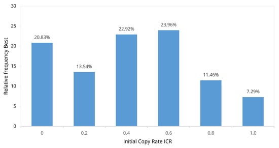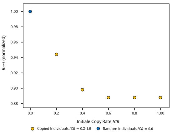 One possibility to evaluate the effectiveness of a copied initial population ICR = 0.2–1.0 is to compare the objective fulfillment of the best solution per experiment (Figure 7). A condensed evaluation is the relative frequency with which an achieves the best value for the objective value per individual experiment. Of the 96 possible individual experiments , a copied initial population (ICR = 0.2–1.0) achieves the best objective value in of the individual experiments. In of the experiments, a randomized initial population achieves the best objective value . The initial copy rate of and is more often used to achieve the best objective value than the initial copy rates and . The following conclusions can be drawn from the distribution of the frequency:
