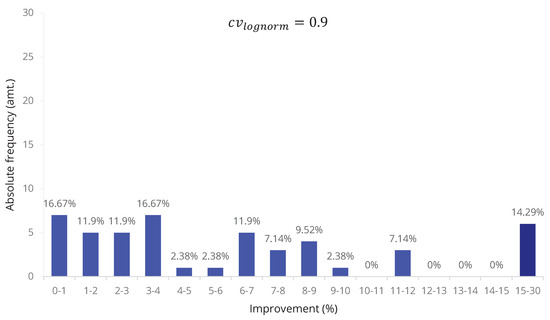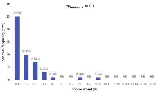 A higher optimization potential is achieved with a coefficient of variation of (Figure 9). In about of the experiments, the optimization potential is higher than . It is remarkable that, in about of the experiments, the optimization potential is between 15–30%. This represents that the optimization potential decreases with large stochastic influences, which represents that the actual process time deviates significantly from the expected value and that the solution is highly random. This corresponds almost to a complete lack of process knowledge so that an online optimization is probably more effective.