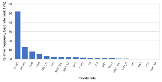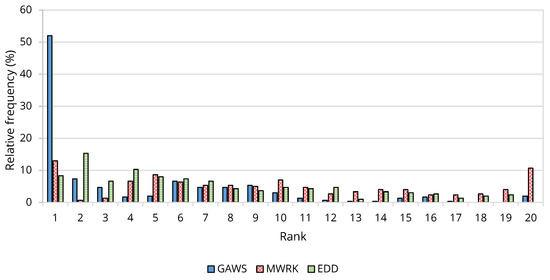 Looking at the three best PRs (GAWS, MWRK, and EDD) in Figure 12, it can be seen that all three PRs are represented on all ranks, with rank = 1 being the best PR and rank = 20 being the worst PR. GAWS is among the 10 best PRs (sum of the relative frequency of GAWS from to ). SPR EDD is among the ten best SPRs in of the experiments (sum of the relative frequency of EDD from to ). It is remarkable that the MWRK comes last in almost of the experiments.