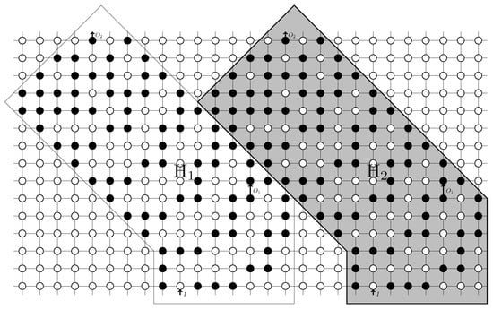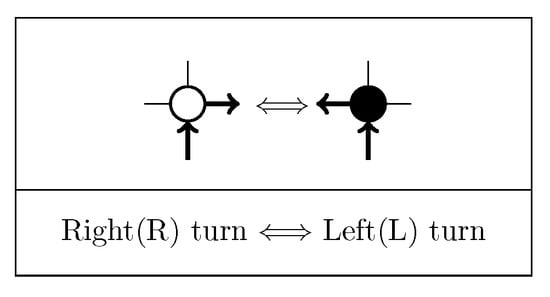 In 1986, Chris Langton proposed an artificial life on square lattice [1,2,3,4,5] where each vertex is either to-right (white) or to-left (black). An ant, represented by an arrow in Figure 1, travels along edges with unit speed and four possible directions. It turns to either right or left, corresponding to the vertex’s white or black color it is heading and switches the color simultaneously. Since then, it is one of the most widely studied cellular automata in many fields, for example, discrete propagation kinetics [6,7,8], Lorentz lattice gas [9,10,11], particle diffusion dynamics [12,13], computational complexity [14,15,16], emergent dynamics [17,18], and cryptography [19,20,21,22,23].