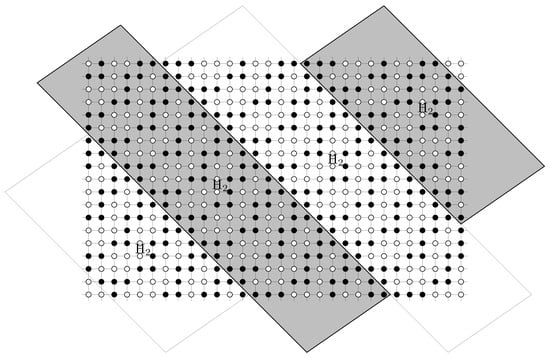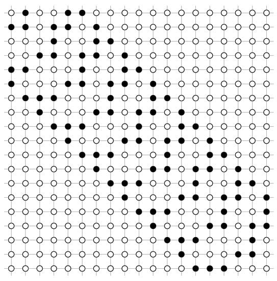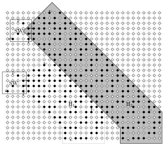 This paper will show that is hard to approximate on a twisted torus. A torus is the standard boundary condition to extend a coloring on to by for . Long-run computer simulation of square lattice cellular automata usually takes this topology [19,20,22]. An h-twist (-pitch) of the torus is . It appears in related models, for example, square-lattice Ising models (Langton’s ant is a typical one) [26,27]. When , may occur even under highway emergence, as described in Figure 3. For this specific case, we can prove the following theorem.