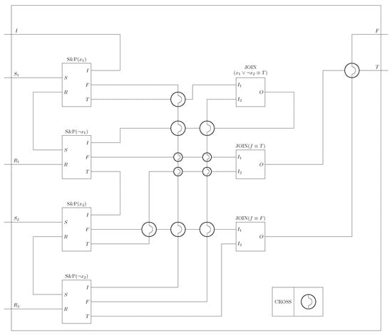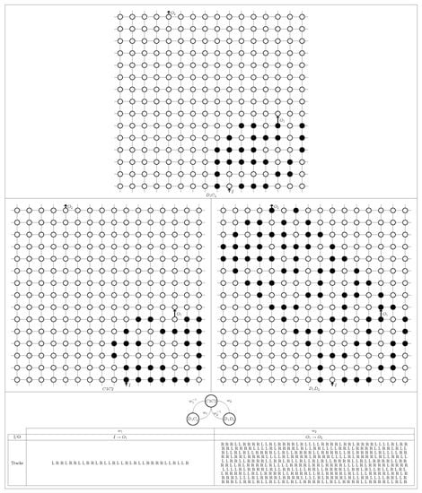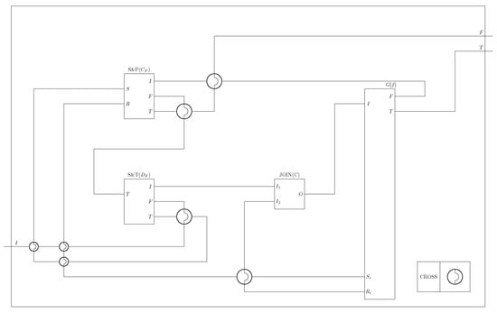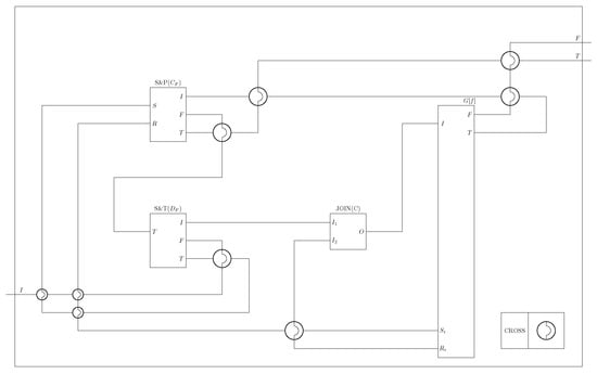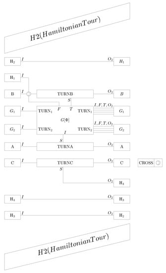 The only difference between Figure 4’s cellular automaton and the previous one in Reference [15] is parsing each k S&T gate inside Figure 22 and Figure 23 to Figure 5’s (SW, HW, FL) gates, and moving out both HW and SW to the outside but remaining the FL there. Observe that the SW gate entails three lines connecting I[SW]–[JOIN], F[SW]-[CROSS], and T[SW]–[CROSS], and the HW gate two lines I[HW]–[FL] and [FL]–[HW]. Each of these lines incurs 2 additional cross gates for preserving planarity through moving-out their gates outside of the k-times cascaded Figure 22 and Figure 23. Consequently, our cellular automaton may conttain more cross gates than that in Lemma 2. The above analysis still holds even suffering this cross-gate incrementation. □