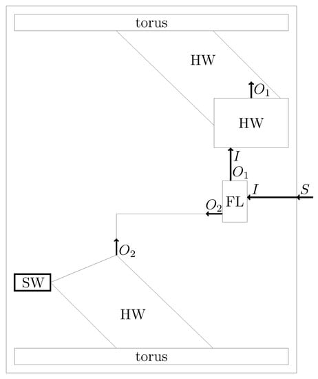 In each odd time visit to Figure 5, the ant gets in from the entrance port S, travels along , and exits from the S it has entered but in the opposite direction. Here, the ant at can get into the FL gate from the exit port since the ant lives in the opposite polarity world before and after taking the HW trip. Each even time visit induces the reversed travel . Observe that the SW’s state has transited as claimed. □