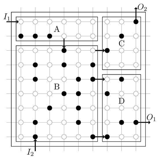 The planar cellular circuit takes a classical Visual Representation (VR) [28,29] for square lattice embedding in Reference [16]. Notice that VR embedding have several aesthetic criteria, say draw edge as straight as possible, vertices should be evenly distributed, minimize bends in the lines. It represents each {S&P, JOIN, CROSS, SW, HW, FL} gate by a horizontal line segment and each path is connecting between them by a vertical line segment. Figure 7’s CROSS gate has size with just one port on each side, around which the ant can move by paths of width 2. Consequently, its VR embedding enjoys both horizontal and vertical sizes .