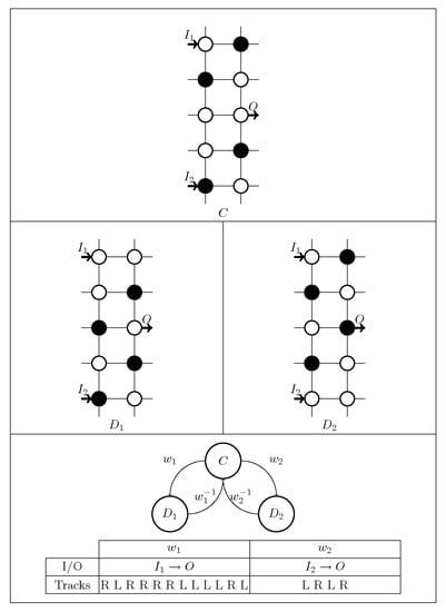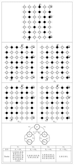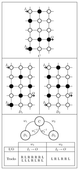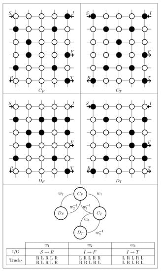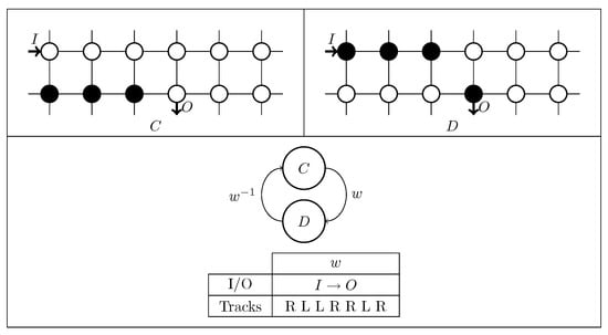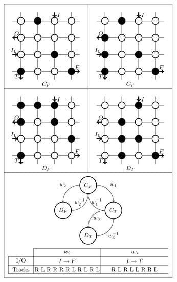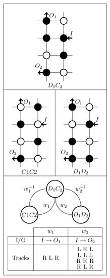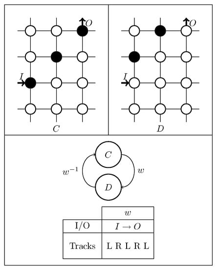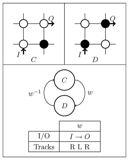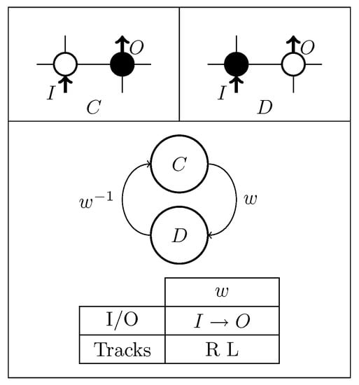 Figure 8, Figure 9, Figure 10, Figure 11 and Figure 12 display gates and their state diagrams called Straight PATH, Bending PATH, JOIN (called CONJ in Reference [15]), S&P (Switch and Pass), and SWitch (SW in short), respectively. These state diagrams are Mealy machines outputting ant’s tracks when state transitions occur. When occurs, the ant must travel from I to O inside the gate along the track (a series of the ant’s moves to either the Left (L) or Right (R) directions). We write it as or . For example, PATH can stretch upwards by alternating Figure 8 with its H&D (H-symmetry and Dual, that is, flipping Horizontally and swapping C ↔ D), I[PATH] O[PATH] →I[H&D PATH] O[H&D PATH] →I[PATH] O[PATH] →⋯, forming a width-2 line, possibly bending to right by Figure 9. It can stretch and turn by 90 degrees to arbitrary directions by taking the symmetric and dual figures. PATH, S&P, and JOIN have the same configurations as Reference [15]. Differences from Reference [15] are parsing a S&T (Switch and Turn) gate in Reference [15] into three gates (SW, HW, FL) in Figure 5, providing a new TURN gate with no gray-color vertex, and a new CROSS gate having a much smaller size.