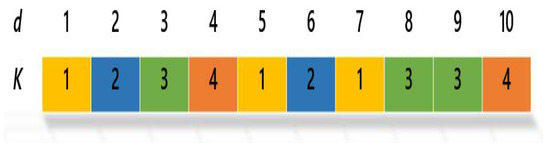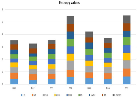 The entropy test measures the partitioning of class marks in each group [101,102]. This test centers on the containment of different cluster classes. A good example has 0 entropy, showing an excellent clustering solution has a low entropy case. The entropy measure of cluster j according to the quantity of each group can be defined using Equation (9):