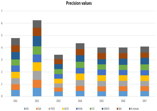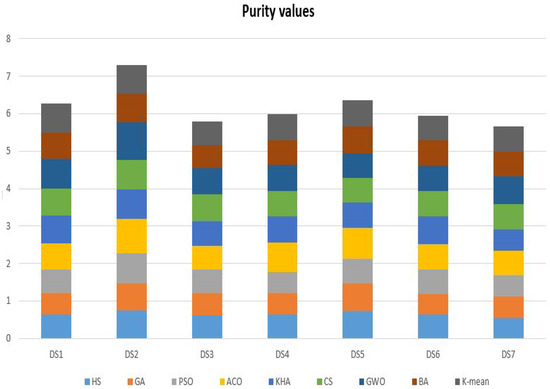 The purity test is applied to determine each cluster’s section in a large class [38,101]. This test indicates each group to the common frequent class. An excellent value of purity is close to 1 due to the percentage of big class sizes in each group, which is calculated based on its size. Hence, the value of purity is in the interval . Equation (7) is used to manage the purity value of the cluster j: