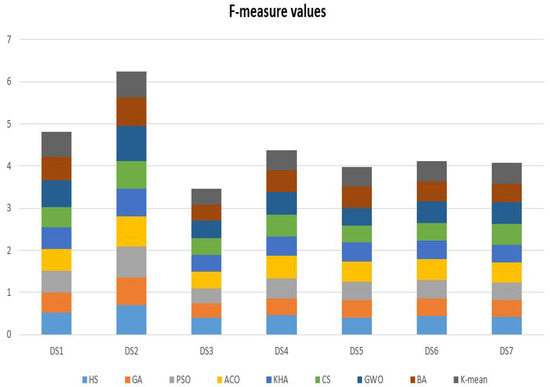 where K is the number of given clusters in the used dataset, is the number of documents that correctly should be in cluster i and is the similarity value calculated between the centroid of cluster j and the document number i. Each solution is given in a binary matrix of size to calculate the clusters centroid, as given in Equation (4) [39].