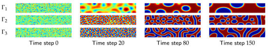The target application for this study is the study of material morphology evolution during the fabrication of organic thin film []. In particular, we use process data produced by the numerical simulation of the morphology evolution. Each input trajectory (denoted as , from here on) corresponds to a simulation which is parameterized by two fabrication process variables, viz.: (i) , or the blend ratio of polymers making organic film; and (ii) , or the strength of interaction between these polymers. Each trajectory consists of a series of “images”, generated over time, where each image is actually a 2D morphology snapshot that is produced by the numerical simulation for a given time step. A simple preprocessing step transforms the image to a high-dimensional vector, . See Figure 1 for some examples of the images that are generated for a selected combination of and . A detailed description of the data and the data generation process is provided in Section 5.