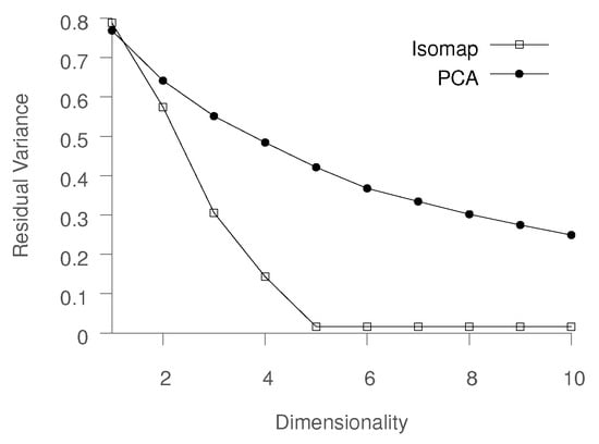 A reliable way of determining the quality of the low-dimensional representation (mapping) produced by each method is to compare the original data in with the mapped data in , by computing the residual variance. The process of computing residual variance for PCA differs from Isomap, but the values are directly comparable.