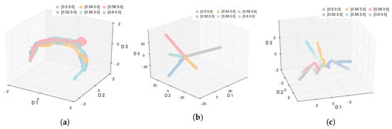 If we visualize the data in 3D space using the PCA representation () (see Figure 3a), we observe that while PCA is able to describe the time aspect of the process evolution, it does not offer any additional insights into the process, making it ineffective for the task at hand. This can be primarily attributed to PCA’s inability to capture the nonlinear relationships between the high- and low-dimensional data.