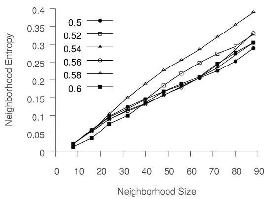 Figure 7b shows how the final neighborhood entropy for the instances belonging to six trajectories vary according to time. We note that, for this data, the threshold for entropy (, set to 0.3 for this experiment) is often not reached even after expanding . Instead, the neighborhood size reaches the maximum limit, M. We believe that this is because the k nearest neighbors for the majority of points are in the same trajectory, (see Figure 4b), which leads to skewed neighborhood distributions. As a result, even when a satisfactory number of neighbors come from other trajectories, the entropy for the neighborhood might be low. Even when the trajectories mix, the neighborhoods are still dominated by other instances in the same trajectory, as shown in Figure 6c. Therefore, while high entropy implies good mixing, the converse is not necessarily true. Large neighborhoods could produce mixing, while still having low entropy. Thus, the entropy threshold is set to be around 0.30–0.40, with further confirmation through experimentation being presented in the next section.