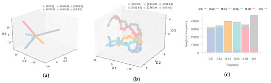 To further study this point, we consider the pairwise distance matrix that contains the distance between every pair of data instances. The rows and columns of the matrix are ordered by the trajectory index and time, as shown in Figure 4a. Consider any pair of row (and column) indices, i and j, such that the trajectory index that contains the ith data instance is I, and the trajectory index that contains the jth data instance is J and , and denotes the time index for each instance within the corresponding trajectory. Then, row i precedes row j in the matrix if either or if .