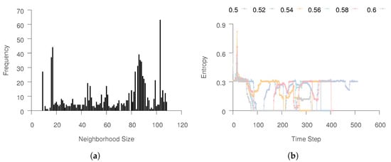 Entropy-Isomap with the default and entropy threshold run for data with and the variables . (Please view in color). (a) Distribution of selected neighborhood sizes that did not reach the maximum . (b) Entropy of the discovered neighborhood for each time step.