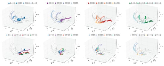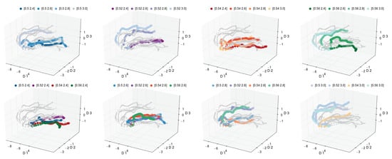 Using Entropy-Isomap, we performed the analysis for a set of morphological pathways. In Figure 8 and Figure 9, we depict the discovered three-dimensional manifold for the set of 16 pathways. In the discovered manifold, the individual pathways are ordered according to process variables that were varied to generate the data. In each figure, the same manifold is depicted eight times. For easier inspection, each variant is individually color coded. The panels in the top row of Figure 8 depict the pathways for fixed and varying . We observe that the pathways for increasing are ordered from front to back. The panels in the bottom row of Figure 8 highlight the pathways for increasing . Similarly to the top row, we observe the pathways to be ordered from right to left.