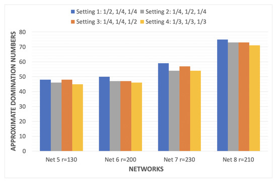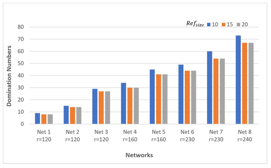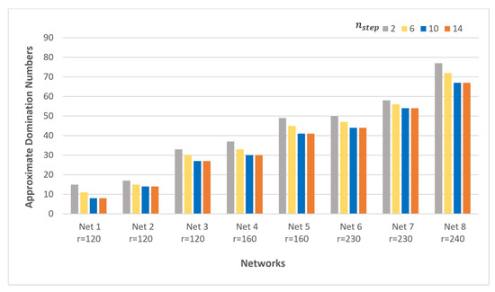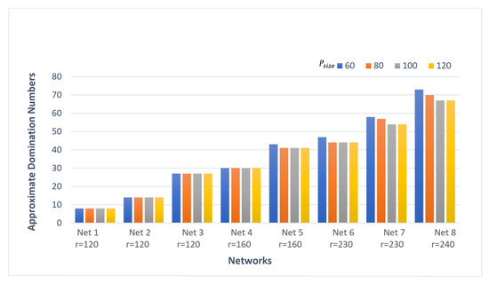 The best solutions vary according to the tuning parameter values which significantly affect solution qualities. In Figure 2, when the value of increases from 60 to 120, the results are improved significantly until a specific limit is reached where the quality of the results is not affected with the increment of the values. For moderate-size networks Net 1, Net 2, Net 3, and Net 4, the value 60 for is enough to acquire the best domination number for the networks. However, this value is not enough for Net 5 and Net 6, so it is increased to 80 to acquire the best domination number. This was also applied for Net 7 and Net 8 when the network became bigger, requiring an increment in values. Consequently, setting equal to 60 for small-size networks helped the proposed algorithm to obtain results with the same quality as those obtained by higher values of . Maintaining small values for this contributed to maintaining the computation cost and processing time. However, the value for large-size networks should gradually be increased according to the size of the network in order to maintain the solution qualities. According to these experimental results, the best value for could be calculated as the following: