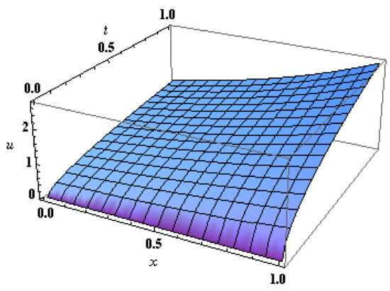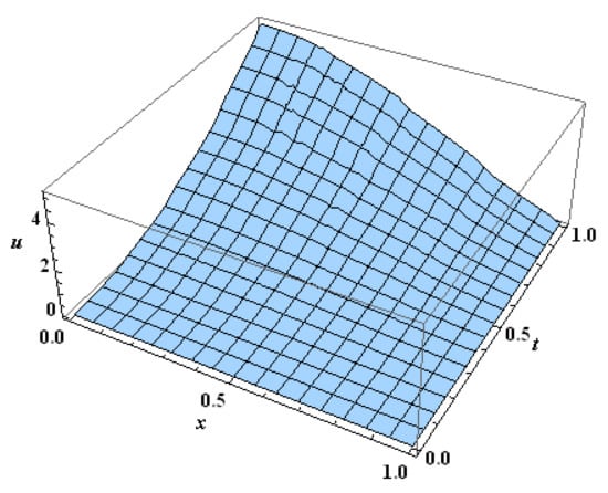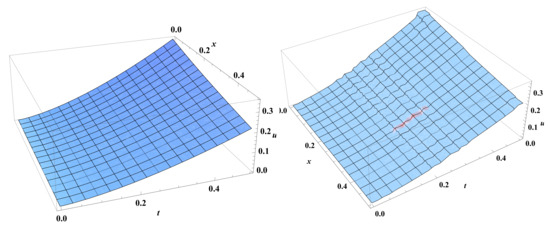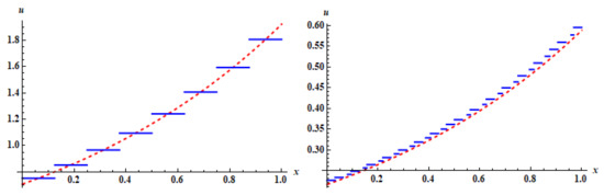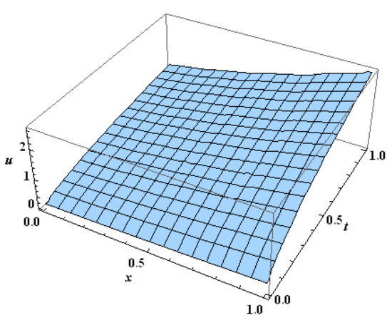 subject to the initial condition . The exact solution is . In this example, we find a numerical solution using the Haar wavelet method and then use the Laplace Haar wavelet method. In either approach, we consider the level of resolution .