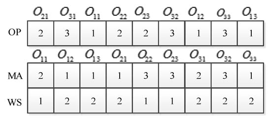 To implement the application of the algorithm in solving a problem, one of the key tasks is to adopt an appropriate encoding method, which can represent the necessary information about the considered problem. The EDRCFJSP is made up of three sub-problems: machine assignment (MA), worker selection (WS) and operation permutation (OP). Therefore, an encoding method with three vectors is adopted to represent the scheduling solution, namely the MA vector, the WS vector and the OP vector, which represent the assignment of operations to machines, the selection of workers for machines and the processing sequence of operations on machines. The size of each vector is equal to the numbers of all operations.