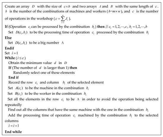 In the second phase, two rules are adopted to generate the MA and WS vectors: the modified assignment rule (MAR) and random rule (RR). The MAR is modified from assignment rule number one in [], whose pseudo-code is illustrated in Figure 2. The approach considers both the processing times and the workload of the machines. For each operation, the procedure includes finding the combination of the machine and the worker with the minimum processing time, fixing that assignment, and then adding this time to the entries in the columns with the selected machine. The RR means that the worker and the machine are randomly selected for the corresponding operation.