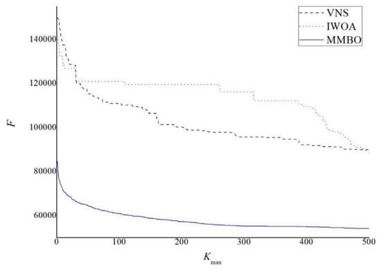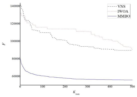 For the MMBO, the parameters are set according to the recommendations by Duman et al. [], which are shown as follows: the population size = 51; the number of neighboring solutions = 3; the number of the shared neighboring solutions ; and the number of tours = 10. In addition, we set ls = 50, = 10 and the maximum iteration . To be fair, MBO1, MBO2 and MBO3 are set with the same parameters. According to Table 2, it can be observed that: (1) the MMBO algorithm obtains the 12 best values in comparison with the best value and outperforms other compared algorithms. The second-best algorithm, namely MBO2, can obtain the six best values; (2) the MMBO algorithm yields the eight best values in comparisons with both the average value and the ARPD value, which performs better than other algorithms. The second-best algorithm, namely MBO2, can obtain the seven best values in comparisons with both the average value and the ARPD value; (3) in comparisons with the ‘time’ value, the MMBO has a longer computational time than other algorithms due to the introduction of the improvement strategies.