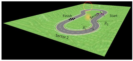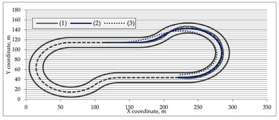 In our experiments, a route called a “fish hook” was constructed (Figure 2). Its length is only 300 m, but its shape contains a straight line, a sharp transition to the left turn, and a long right turn afterward. Such a track belongs to a difficult type of tracks for a human driver.