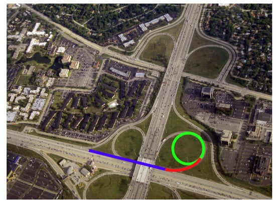 Usually, during the first section of the route—straight—the driver accelerates and, at the maximum speed, begins the passage of the turn. The peculiarity of this rotation is that it does not contain a transition spiral curve part between the straight and the rotation sections. A spiral curve is a geometric element that can be added to a regular curve and provides a gradual transition (red part in Figure 3) from movement in a straight line (blue part in Figure 3) to movement along a circle (green part in Figure 3).
