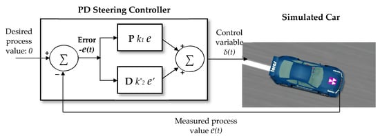 where e’ is the first derivative of the lateral deviation of the car from the center of the lane. From the PD controller point of view, servo control model represents by itself a closed-loop system. The input—measured process value is equal to the absolute value of the error e—the deviation of the car from the center of the lane. Its output—the control variable—the steering angle δ, is a sum of the proportional (P) and derivative (D) terms of the error. The controller attempts to minimize the value of the error by constantly adjusting the steering angle δ, which, presumably, would yield a trajectory as close as possible to the center of the lane.