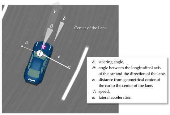 Here, and are predicted coordinates of the position of the car, is the angle of the road at the point that is closest to the car, F is the function calculating the distance between the car and the center of the lane, , is the speed of the car, and its two orthogonal components, respectively, . is the predicting time interval, and α is the angular deviation of the car from the center of the lane.