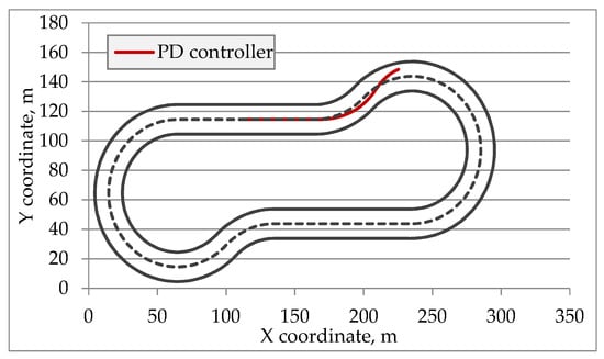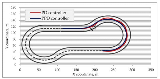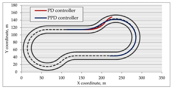 The main common disadvantage of both PD controllers is lagging. It results in an even worse effect on the slippery road. In addition, many real-world physics effects are not taken into account in the controller equations. In practice, these disadvantages lead to the late entrance to the turn, attempts to return to desired trajectory, oversteering and disadvantageous position at the start of second turn, exiting, which could only result in consecutive course deviations, as demonstrated in Figure 6.