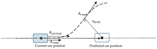 where θ is the angle between the car direction and the road, and epredicted is the distance between the predicted car center and the road calculated by the following Equations (5)–(9):