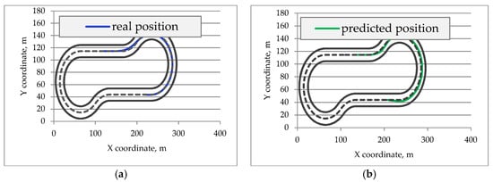 Real trajectory of the car (a) and predicted position of the car (b). Time of the prediction—1.5 s, = 0.1.