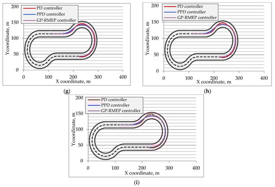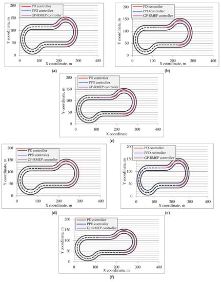 As the results shown in Table 5 demonstrate, the PPD controller outperforms the PD and is comparable with the GP-RMEP controller in terms of target quality function. Thus, the new controller has a trajectory close to the best trajectory obtained with the GP controller but does not have oscillations that could lead to mechanical damage []. Since, according to our earlier studies [,], oscillations in the GP-RMEP method are part of its tactics aimed at increasing and maintaining the largest slip angle on tires and, accordingly, cannot be removed from the method without reducing the speed and safety of the car, the result we obtained, which is close in quality to GP-RMEP and free from oscillations, is an important result for us.