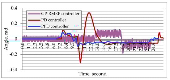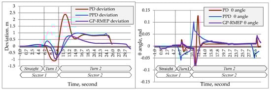 These numbers, as well as the values of the target quality function, indicate the remoteness of the results occurred by each method from the desired ones (if they were equal to zero, the car would move along the chosen trajectory without deviations caused by instability). In other words, these numbers could be interpreted as the error amount of methods. Figure 13 demonstrates distance and angle errors for all compared methods. In these terms, PPD performs better than PD and has similar changes of amplitudes with the GP-RMEP controller.