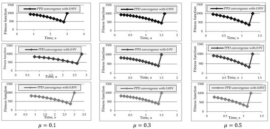 Target quality function convergence of the PPD controllers under the different speed levels and friction values (µ = 0.1, 0.3, 0.5) depends on time prediction.