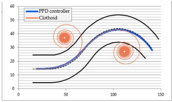 According to the researches [], the best and smoothest transition curve to be used as a section of the path is the clothoid. The fact that the PPD controller we developed approached the same conclusion with its results, along with their comparison with the results of other controllers, once again indirectly indicates the effectiveness of the new controller.