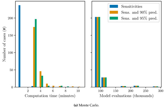 The computational cost of the Monte Carlo simulations is mainly from evaluating the model many times. The polynomial chaos expansion requires fewer model evaluations but also involves large regressions to obtain expansion coefficients. In Figure 10, the computation time (left) and number of model evaluations (right) required for convergence are compared between MC and PC. The colors represent the criteria used for convergence. Blue is only convergence in sensitivities while orange and green is the cost if we also want convergence in prediction intervals on confidence level 90% and 95%, respectively. All cases converge for MC while some do not for PC. The number of cases without convergence is given as an entry on the right hand side. Notice the different scales on the axes for MC and PC.