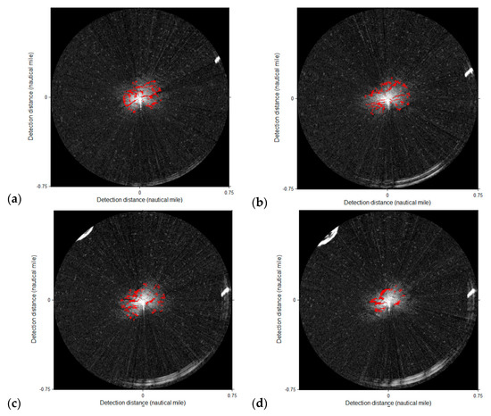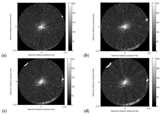 Original radar images, where (a–d) were acquired at 23:19:58, 23:20:27, 23:21:03, and 23:21:09, respectively.