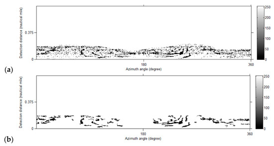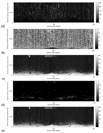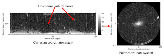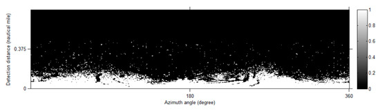 A shipborne radar image was collected in the Cartesian coordinate system and then transformed into the polar coordinate system. The morphological features of targets are easier to recognize in the Cartesian coordinates system. For example, the co-frequency interferences caused by the radars of other ships show high-bright linear noise in a vertical direction (Figure 4), and therefore, we first transformed the image back to the Cartesian coordinate system with the azimuth as the horizontal axis and the detection distance as the longitudinal axis. The flow of data preprocessing is shown in Figure 5. Firstly, the Laplace operator of Equation (1) was used to enhance the gray value of the highlighted pixels (Figure 6a). The image was then segmented according to the mean value (Figure 6b). The corresponding highlighted pixels in the original image were smoothed by a linear mean filter (Figure 6c). The isolated targets were extracted by the Otsu [38] threshold and the area threshold Tarea (Figure 6d), and then removed with a median filter (Figure 6e). The window of the median filter must be larger than Tarea.