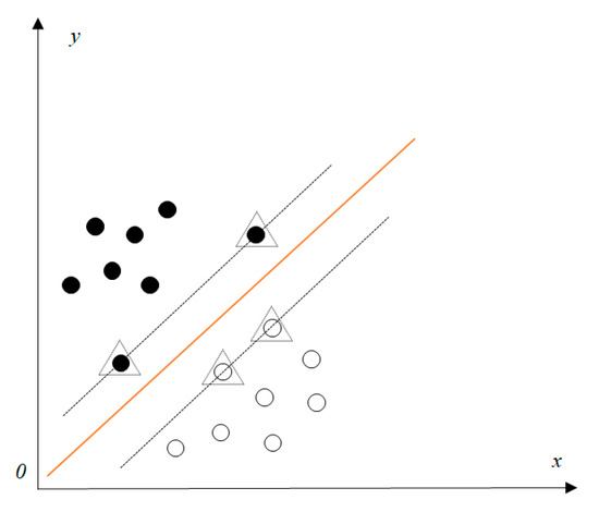Support vector machine (SVM) is a type of generalized linear classifier for binary classification by supervised learning, and has been widely used for remote sensing [37,40] and computer graphics [41,42]. It can find an optimal hyperplane in the feature space and divide the data into two categories (Figure 8).