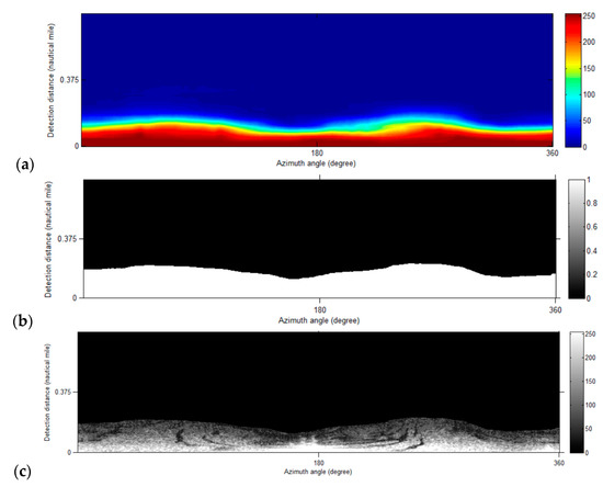 The effective monitoring range of ocean waves is limited in radar images, and so, the echo signals of ocean waves in farther regions are few or even none. It is therefore necessary to first determine the effective monitoring range of waves. The image was filtered by means of a window of 20×160, and a gray distribution matrix was generated (Figure 10a). According to the threshold of gray intensity, the mask of the effective range of the ocean wave was established in Figure 10b. The final pre-analyzed image area is shown in Figure 10c.