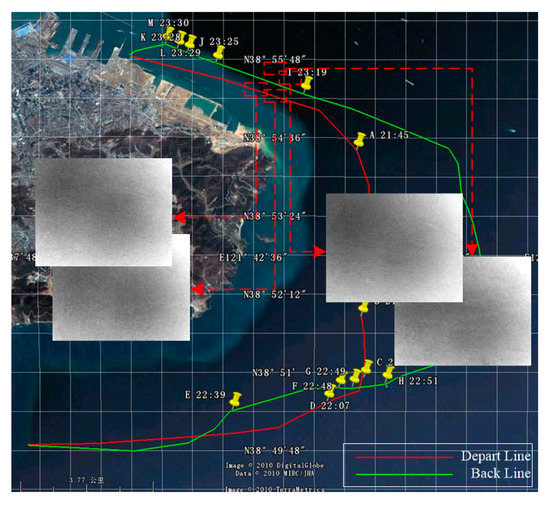 During the daytime, airborne visible light sensors captured many oil films at sea (Figure 14), but the cruise time of radar image data acquisition was during the nighttime. We validated the feasibility of our method by using images captured by shipborne infrared sensors in Figure 14. In the nighttime, thermal infrared images oil films have somewhat lower grey values than water in thermal infrared images [9,14]. In Figure 15, the position of the oil film in the infrared image is the same as the position in the radar image, and therefore, our method is feasible.