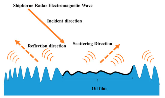 Shipborne radar oil spill monitoring is based on the characteristics of sea clutter. Figure 16 shows that shipborne radar transmits electromagnetic waves onto the sea surface with Bragg scattering. However, the oil film covers the surface and reduces the gap between peaks and wave troughs. A smooth oil film surface can reduce backscattering wave beams (Figure 17), weakening the signal in the oil film region more than in other regions.