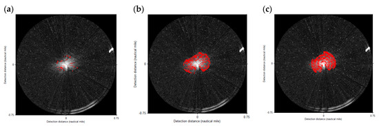 Zhu et al. [34] proposed a global threshold method for the identification of oil films in shipborne radar images. Based on the gray distribution matrix, Xu et al. [35] proposed a dual-threshold method (gray and area) to detect oil spills. Liu et al. [48] used an iterative method and an adaptive threshold to obtain the oil spills. These methods were used for comparisons with our method (Figure 19). The classification of oil films is based on the relative dark area, and the gray values of oil films are different in diversified wave areas. To reduce the misjudgments of oil films, Zhu’s and Xu’s methods therefore needed to adopt a lower global threshold value, but they still misinterpreted the long-distance weak waves as oil spills. In Liu’s method, the adaptive threshold was applied and better results were achieved, but some oil films were missed. In addition, their iterative method forgoes efficiency. Our result (Figure 12b) is closer to the expert visual interpretation than the three aforementioned methods. The results show that the local adaptive threshold is more suitable for the extraction of oil spills in shipborne radar images.